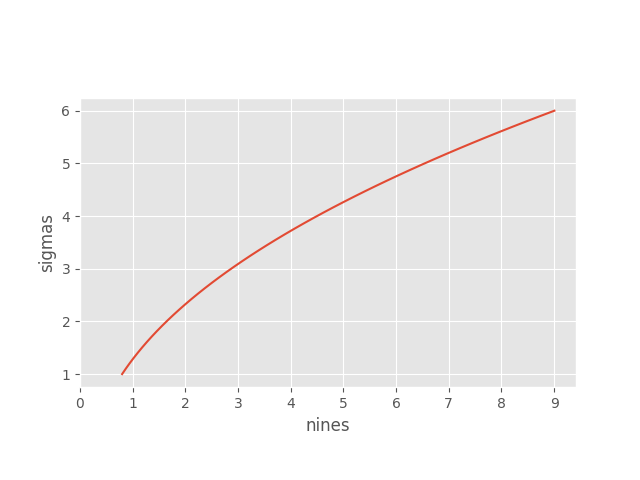 Sometimes you’ll hear that a process has so many nines of reliability or that the error rate is so many sigmas. A few years ago I wrote a post on converting between nines and sigmas. See that post for details, approximations, etc.