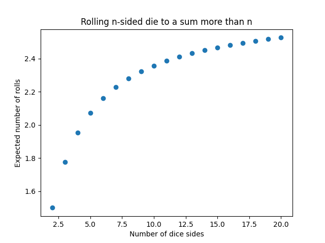 According to [1], the expected number of rolls of an n-sided dice for the sum of the rolls to be n or more equals