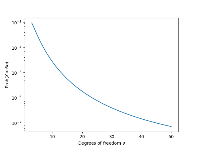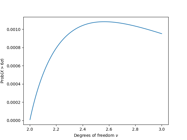 So six sigma probabilities for a Student t distribution rise from 0 up to a maximum of around 10−3 then decrease exponentially, then asymptotically approach a value around 10−7.