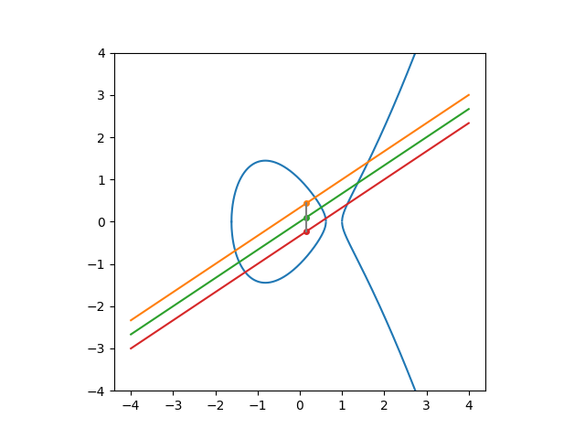 [2] See the description of Bézout’s theorem in the previous footnote. In the elliptic curve example, the parallel lines meet at a point at infinity. A line that misses the closed component of the elliptic curve and only passes through the second component has 1 real point of intersection but there would be 2 more if we were working in ℂ² rather than ℝ².