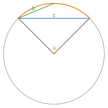 Suppose you have an arc a, a portion of a circle of radius r, and you know two things: the length c of the chord of the arc, and the length b of the chord of half the arc, illustrated below.
