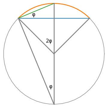 Let φ = θ/4. Then the angle between the chords b and c is φ. This follows from the inscribed angle theorem, illustrated below.